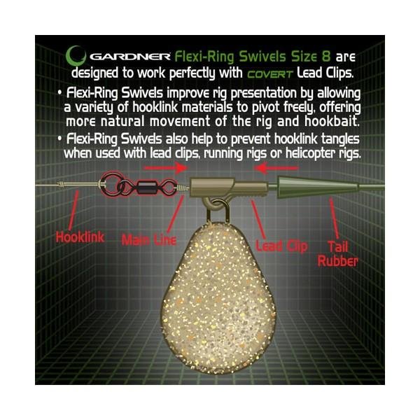 A Covert Flexi-Ring Swivels egy extra erős, kimagasló teherbírással rendelkező, nagy átmérőjű gyűrűvel ellátott forgó. Alapelve az, hogy segítségével a merev szerelékünkbe egy olyan pontot tegyünk, ami körül előkénk szabadon mozoghat. Ez nagyban megnöveli a csalink természetes hatását. A gyűrűnek köszönhetően a ponty bármelyik irányból is próbálja meg felszívni csalinkat, az mindig az ajka felé fordítja horgunkat. Használatával az óvatosabb és a gyengébben táplálkozó halak is becsaphatók. A standard 8-as méretben kapható Covert Flexi-Ring Swivels tökéletesen illeszkedik a Covert lead Clips-hez és az inline ólmokhoz. Míg a kisebb, 12-es méret használata elengedhetetlen a 360 rig, a Chod és a Helicopter szerelékek elkészítéséhez. Előnye még, hogy gubancmentes dobásokat is biztosít. A minden helyzetben megbízható forgó felületét egy matt, kopásálló, csillogásmentes réteggel vonták be, hogy a víz alatt csökkentse a láthatóságot.